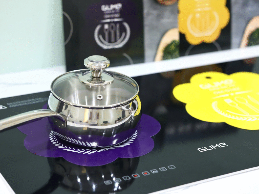 Miếng lót bếp từ thường làm từ silicone chịu nhiệt hoặc sợi thủy tinh phủ PTFE, đặt giữa đáy nồi và mặt kính.